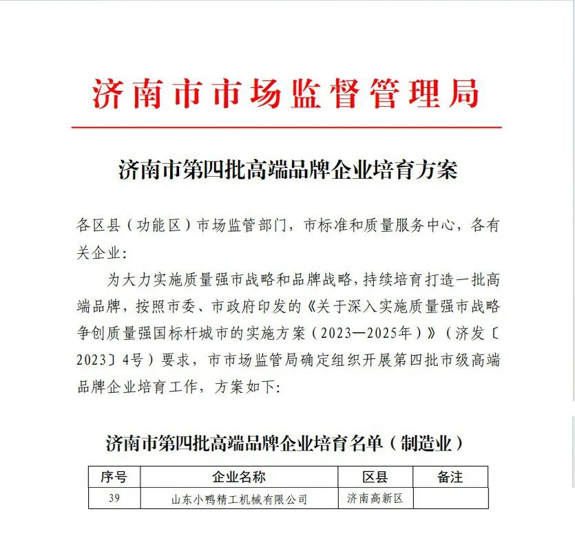 濟(jì)南市市場監(jiān)督管理局公布了濟(jì)南市第四批高端品牌企業(yè)培育名單。經(jīng)組織申報、資格審查、專家評審、綜合評價、結(jié)果審定等層層選拔,小鴨精工成功入選高端品牌企業(yè)培育名錄(制造業(yè))。